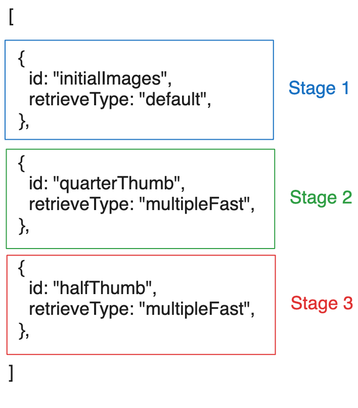 Progressive loading works in steps called stages. Each stage is part of which images load with which settings, and you can set each stage with different settings, known as retrieve options. Together (stages and options) make up the retrieve configuration, which manages how images are loaded step by step. Let's dive in.